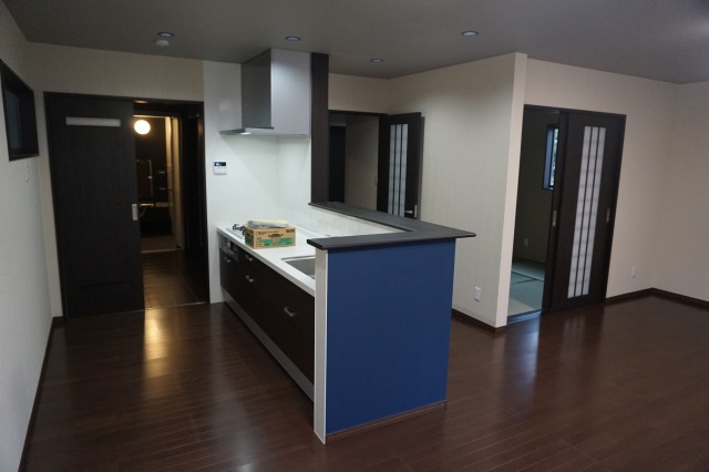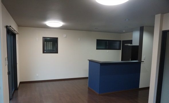 キッチン前の腰壁のみネイビーブルーのアクセントクロスを施工。